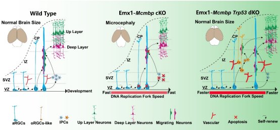 大脑皮层作为哺乳动物大脑进化的关键特征,调控感觉、情绪、睡眠、运动、学习和记忆等功能。复杂的大脑皮层结构主要通过一系列精密协调的神经发生过程来形成,其中神经前体细胞对大脑皮质形成以及功能的产生至关重要。DNA复制作为基因组复制的基石,在神经发生阶段的产生扰动的话,会导致大脑发育障碍,但具体的遗传发育机制并不清楚。