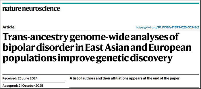 2025年11月25日,由中国科学院昆明动物研究所李明研究员与肖潇研究员领衔,联合国内外多家机构的科研团队在双相障碍遗传学领域取得重大进展,相关成果发表于Nature Neuroscience,标题为Trans-ancestry genome-wide analyses of bipolar disorder in East Asian and European populations improve genetic discovery。研究整合了迄今最大规模的东亚人群双相障碍遗传资源,其中包括了来自中国大陆汉族人群的5,164例患者与13,460例对照,通过联合精神病学基因组学联盟的东亚与欧洲人群数据,利用近9万例患者与96万名健康对照的样本,首次系统完成了“欧洲–东亚”跨族裔比较与整合分析。
