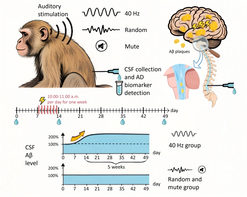 研究采用随机对照设计。实验组连续7天接受每天1小时的40-Hz听觉刺激,刺激音为1 k-Hz纯音。结果显示,刺激结束后,该组猴脑脊液中Aβ42与Aβ40两种关键蛋白水平分别提升了205.61%和201.00%,差异具有显著统计学意义。该结果与小鼠模型中的发现一致,支持40-Hz刺激可促进脑内β淀粉样蛋白清除的假说。