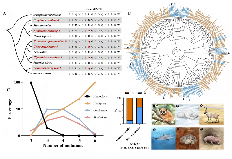 冬眠是动物应对极端环境的一种生存策略。在冬眠期间,动物的体温、代谢率和耗氧量会大幅下降,身体会长时间处于低氧状态。哺乳动物冬眠表型相关的生物学机制仍未被完全揭示,基于此,团队通过对六种冬眠哺乳动物以及五种非冬眠近缘物种的基因组进行比较,识别出5,561个高置信度的直系同源基因。运用保守位点收敛(CCS)和正选择(MEME)分析方法发现,POMT2基因第708位的精氨酸(R)被谷氨酰胺(Q)替换这一现象可能与冬眠性状相关。在所分析的244种哺乳动物里,该变异在多种适应缺氧环境的哺乳动物中普遍存在,频率高达65.06%,呈现出强烈的自然选择信号。