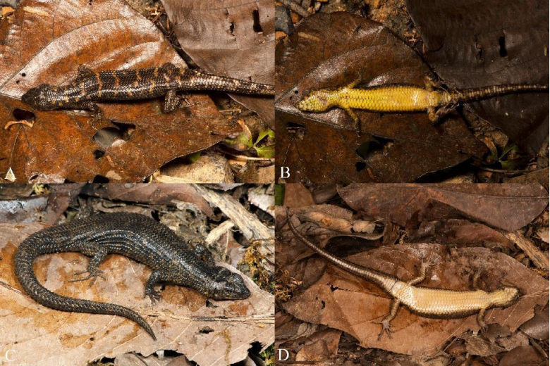 招龙棱蜥模式标本的活体照,A、B展示雄性正模;C、D展示雌性副模;标本保存于中国科学院昆明动物研究所标本馆。