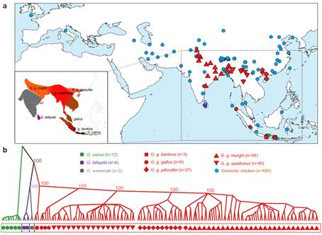 为系统性地解析家鸡的起源和驯化,中国科学院昆明动物所张亚平课题组,吴东东课题组联合国内外研究人员,经过多年的努力,获得了全部5个红原鸡亚种的基因组数据,以及分布于东南亚、南亚、中东、东亚、欧洲等地区家鸡的全基因组数据,通过大量的群体遗传学分析,发现家鸡并不是以前认为的多地独立起源,印度、中国北方等并非家鸡的起源地。家鸡是由Gallus gallus spadiceus亚种驯化而来。目前Gallus gallus spadiceus亚种主要分布在中国西南、泰国北部、缅甸等地区,说明该地区很可能是家鸡的驯化中心。研究人员进一步分析了家鸡基因组中所受人工选择作用,发现大量生殖相关基因在家鸡驯化中受到人工选择作用,进一步支持人类驯化促进家养动物生殖行为的改变。
