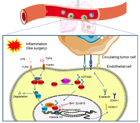 肿瘤转移是癌症患者生命的最大威胁。肿瘤细胞从原位播散到远端器官涉及多个生物学过程。目前,针对肿瘤转移尚无十分有效的预防和治疗方法。血管内皮细胞是被覆于血管内壁的单层细胞,在肿瘤血行转移过程中扮演重要角色。当受到LPS和TNFα等炎症因子刺激时,血管内皮细胞上调表达多个粘附分子如E-selectin,VCAM-1和ICAM-1,能与肿瘤细胞上相应的配体结合,发生粘附,从而将血流中的循环肿瘤细胞(CTC)捕获,促进肿瘤细胞在远端器官定植从而发生转移。手术切除是大多数原发性实体瘤的常见治疗手段,然而,手术却也存在增加肿瘤转移的风险:1、手术创伤造成开放性伤口增加肿瘤细胞在血流中的扩散;2、手术创伤引发的系统性炎症增加血管内皮细胞对CTC的黏附,增加肿瘤细胞在远端器官定植。