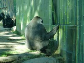 圣地亚哥动物园,千辛万苦找到大猩猩的时候,却见它们正一溜小跑,赶往某处。我也连忙在巨大的玻璃墙外跟着跑,它们一直跑到一个僻静的角落。近10只大猩猩,安静下来,或坐或轻微走动,集中在墙角。有的背靠墙,伸直腿,用手惬意地握住脚指头,扭头看玻璃墙外的观众;有的蜷起脚,蹲坐着,同时用手威严地杵着地。它们的脊背挺得非常直。这时,有的大猩猩不时走到墙的一边,不耐烦地用手推一扇窗,间或拍打几下,这些大猩猩看起来年轻些,也许是小朋友。其它大猩猩不予理睬,但时不时过来瞄一下。有的大猩猩干脆面对小窗而坐。那窗不仔细看根本看不出来,因为整面墙都画满绿茵茵的竹子,一派茂密森林景象。一米小窗就悄然凹陷在茂密竹林中。要不是年轻的大猩猩总是用手拍打,根本发现不了。有时,大猩猩直立站起来,用一只手杵在窗沿上,另一只手插在腰上,活像一个倚靠墙壁小憩的人。