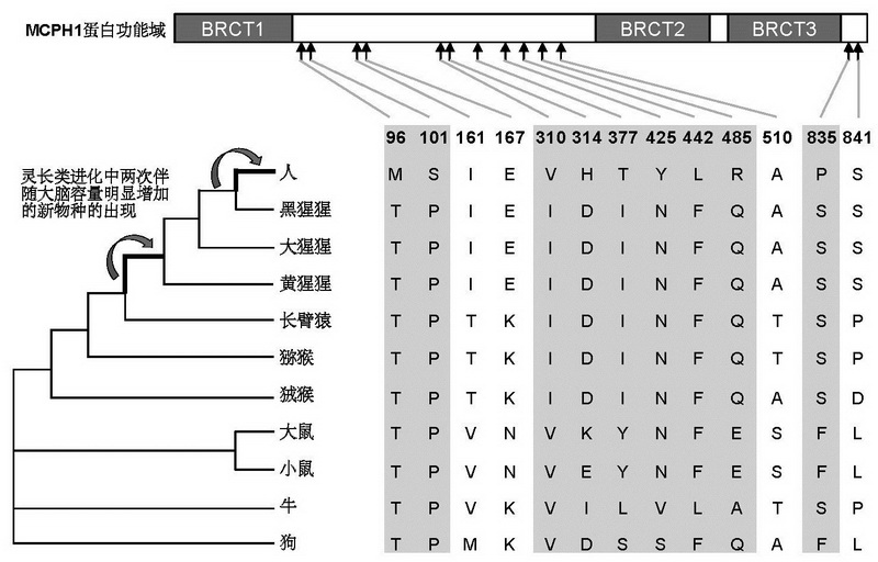 最近,宿兵研究员的实验室(助理研究员石磊)通过对MCPH1的蛋白序列比较分析(见下图),鉴定了一组人类和大猿特异的氨基酸突变,并对这些突变位点的功能效应进行了系统研究。他们发现,MCPH1基因中大部分的人类特异突变位点都会改变其对下游基因的调控效应。这表明MCH1基因在人类与非人灵长类之间已经发生了明显的功能分化,且这种功能分化可能是导致人类起源时大脑容量急剧扩增的关键动因之一。