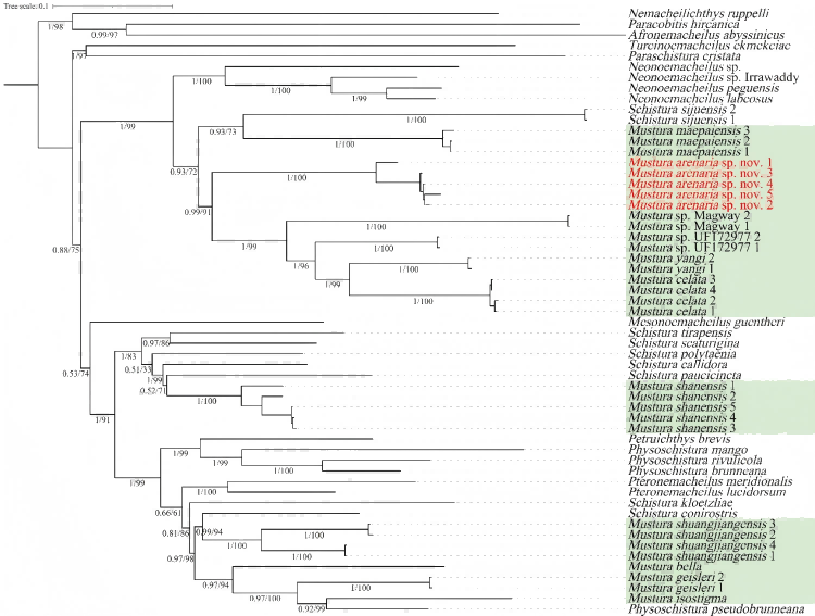 此外,系统发育分析显示迷鳅属在进化树上呈多系性。通过对掸邦迷鳅(Mustura shanensis)近地模标本的形态检视和分子系统发育研究,发现该物种与南鳅属(Schistura)物种亲缘关系更近,因此本研究支持将其划入南鳅属。鉴于迷鳅属物种遗传性状与形态特征之间的不一致性,亟需对该属及其近缘属开展涵盖更多物种的全面分类修订。