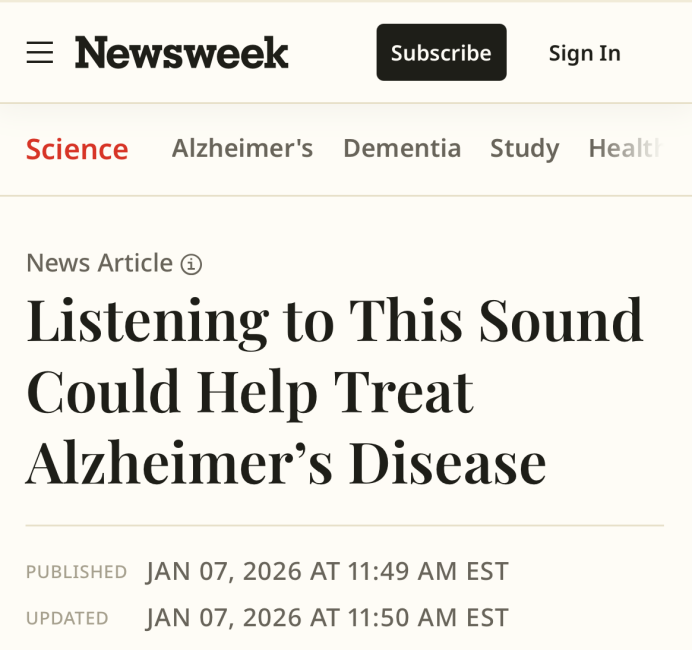 这项研究首次在非人灵长类动物模型中证实,40赫兹频率的听觉刺激能有效、持久地提升脑脊液内β淀粉样蛋白水平,为阿尔茨海默病的非侵入性物理治疗提供了关键证据。美国《新闻周刊》于2026年1月7日以《Listening to this sound could help treat Alzheimer’s Disease》为题,对此项突破性研究进行了科学新闻报道。