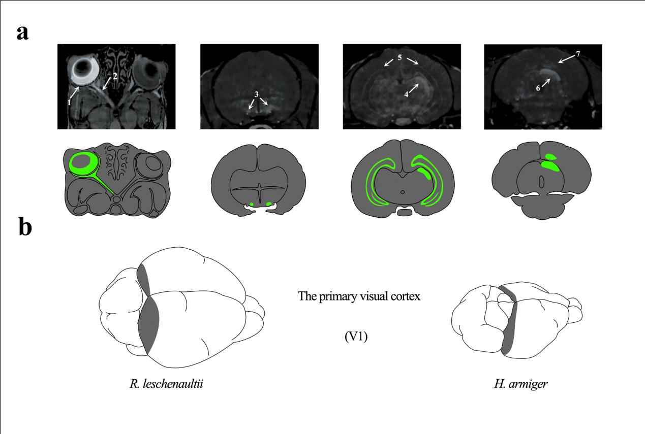 为进一步系统地揭示翼手目暗视觉适应性机制,张亚平院士课题组与胡新天研究员课题组、武汉物理与数学研究所徐富强研究员课题联合攻关,并在沈永义副研究员的带领下,博士研究生刘鹤群、魏景宽和李博首先利用锰离子增强磁共振成像(MEMRI)技术扫描蝙蝠大脑结构,对比各种蝙蝠视觉和听觉系统的结构差异,发现旧大陆果蝠具有较大的上丘(参与视觉信息处理),其上下丘体积比约3:1,食虫蝙蝠具有较大的下丘(参与听觉信息的处理),其上下丘体积比约为1:7,揭示了翼手目动物暗视觉分化的脑结构基础;随后,利用闪光诱发电位技术对蝙蝠的视觉能力进行了量化,发现它们绝对光感知阈值为:旧大陆果蝠>墓蝠>中菊头蝠(小蝙蝠亚目,回声定位),反映这些不同蝙蝠物种的视觉能功能的差异。最后,利用转录组测序技术(RNA-seq)对5种蝙蝠的视网膜转录组进行测序,从序列变异(正选择、趋同/平行进化)和表达两方面进行了适应性信号检测,并发现墓蝠眼部基因的转录组水平表达模式和狐蝠科更为相近。这项研究从结构、功能和分子机制等多角度系统得阐述了翼手目暗视觉分化的机制,为复杂性状的适应性机制的研究提供了示范。