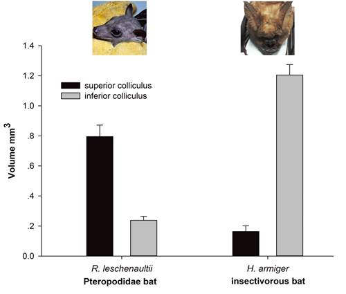 图2 大小蝙蝠上下丘体积比
