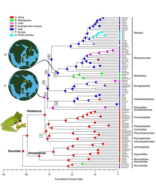 两栖类作为重要的陆生脊椎动物代表类群,由于其独特的生理特性,以及较弱的迁移能力,长期以来是进行生物地理学研究的理想对象。通过长期的研究积累和广泛的国际合作,车静研究组与合作者收集了各大陆蛙超科主要代表类群物种,基于探针杂交富集(Hybrid enrichment)的高通量测序方法,最终获得了376个核基因序列,以此构建了21个科的系统发育关系,重建了该类群在全球尺度的时空演化树(图2)。该实验结果揭示,蛙超科起源于非洲,在75.6–72.8 Ma左右通过印度板块扩散到了亚洲,随后(约62.4–47.2 Ma)经历了一次从亚洲通过印度板块至马达加斯加的扩散事件,演化出了现今马达加斯主要的树栖型蛙类(曼蛙科Mantellidae)。因此,中生代晚期印度板块从冈瓦纳古陆分离后,在亚洲、非洲和马达加斯加之间充当着“脚踏板”的角色,促进了各大陆间生物的扩散与交流,推翻了传统观点认为的印度板块在向北漂移过程中只扮演着一个孤立的“方舟”角色的假说。