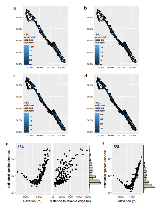 在本研究中,该保护区被划分成172个巡逻区,由163位护林员在巡视过程中采集了总共30,468只蚂蝗,在由这些蚂蝗得到的iDNA数据中,我们鉴定得到86个脊椎动物物种,包括两栖类、哺乳类、鸟类和爬行类,其中有15个被IUCN认定为受威胁或接近受威胁的物种。我们的多物种占据模型分析结果显示:在群落水平,物种丰富度随着海拔的升高以及与保护区边缘距离的拉长而增加;在物种水平,绝大多数大型野生哺乳动物(如水鹿、黑熊、苏门羚、毛冠鹿)在较高海拔、靠近保护区中央的地区分布更多,而家养动物物种(牛、绵羊、山羊等)和一个野生动物物种(赤麂)则在海拔较低的、靠近保护区边缘的地区分布更多。