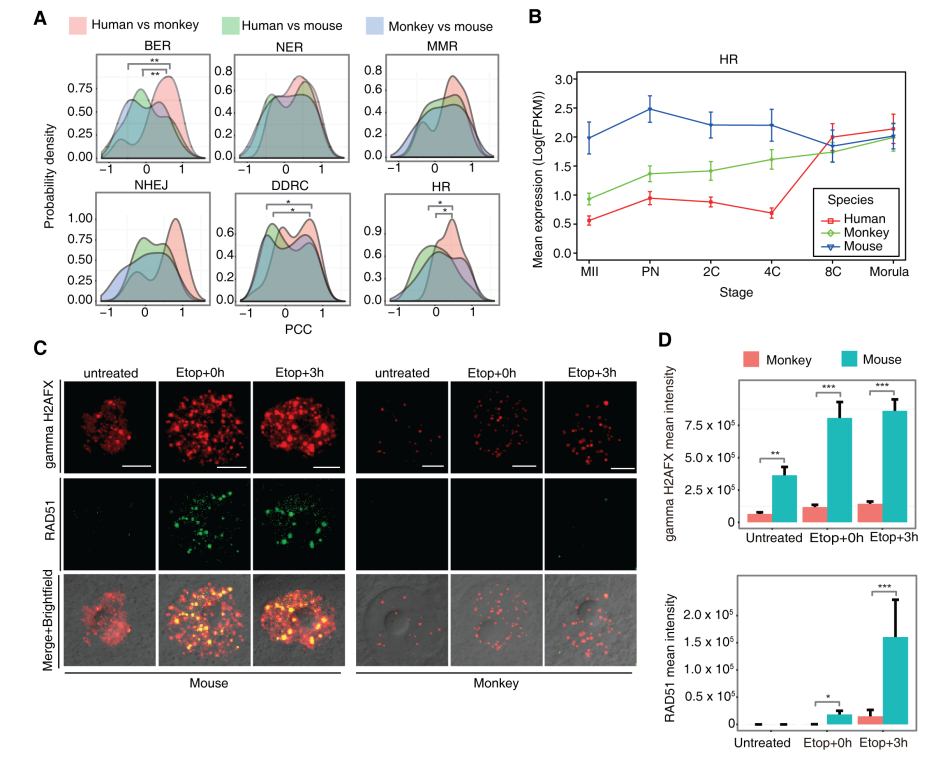 已知灵长类的早期胚胎与小鼠比较,具更高的染色体异常发生率及胚胎发育失败率,但机制并不清楚。通过绘制首个详尽的猕猴着床前不同阶段胚胎发育基因表达图谱,该工作发现了可能调控猕猴胚胎合子基因组重编程及合子基因组激活的母源基因和调控网络。并且,通过系统比较和分析小鼠、猕猴及人卵细胞及早期胚胎发育表达谱数据,结合功能验证,揭示了灵长类(猕猴及人)卵和早期胚胎维持遗传物质稳定性的能力显著低于小鼠,差异主要表现在DNA损伤反应通路的激活及DNA同源重组介导的损伤修复途径上。这一研究结果提示,非人灵长类动物(如猕猴)较小鼠更适合于研究人类早期胚胎发育调控机制。也解释了人及非人灵长类早期胚胎存在较高的染色体不稳定性及发育成功率低下的现象。最后,论文还指出了当前在猴中利用CRISPR/Cas9技术及DNA同源重组原理,进行精准基因替换效率极其低下的内在原因,并提出在1-细胞合子期通过导入重组酶增强同源重组能力,有望能提高猴精准基因敲入的效率。