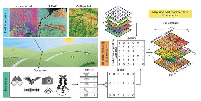 为此,Douglas Yu提出通过将自动记录装置、高通量DNA测序技术、先进的生态模型和遥感技术结合起来,实现有效、实时、大尺度的生物多样性管理监测的构想。文章指出,遥感数据和其他的地理数据可以得到时间、空间上连续的生物物理数据,而在样点上利用传统的生物多样性研究方法,如自动录像或图像记录设备、高通量条形码或者线粒体宏基因组技术,又可以得到物种在某些样点的生物多样性信息。但这些样点信息通常是不连续的,无法覆盖到整个景观区域。因此,可以将这些样点信息结合遥感技术来推测整个景观的生物多样性组成,并绘制出生态系统功能和生态系统服务的地图。那么如何将遥感观测结果和样点的高通量生物多样性数据结合起来呢?文章认为,统计模型是连接两者的桥梁。遥感技术能得到大尺度、高分辨率、时间上连续的地图,但是无法直接转化成生物多样性信息。相反,在样点可以得到精确到物种或者个体的大量生物多样性信息,但只限于某些样点。如今,现有的统计模型方法可以利用样点信息和遥感技术来构建连续的物种地图,甚至可以根据采样和分析方法来估计物种丰富度或者生物量。目前有3种统计模型可以实现这一目标,它们分别是联合物种分布模型、群落占据检测模型以及广义相异模型。