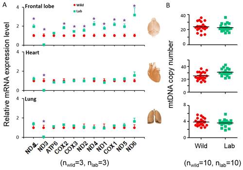 研究人员利用群体遗传学方法,例如FST以及cross-population extended haplotype homozygosity (XP-EHH)等,在全基因范围内扫描了野生褐家鼠与实验大鼠群体之间出现分化的区域,发现大量神经系统基因在大鼠驯化过程中受到人工选择作用,例如在学习记忆方面起重要作用的FOXP2和B3GAT1,以及节律相关基因CLOCK。有意思的是这些基因在实验大鼠的神经组织中的表达水平显著上调,有助于提高学习记忆能力。研究人员推测学习记忆能力的提高可能是实验大鼠被成功驯化的关键。另外,基于转录组分析及qPCR数据揭示能量代谢相关基因在实验大鼠大脑组织中显著上调,这些都为我们进一步揭示实验大鼠驯化的遗传机制奠定了良好的基础。相关工作近期发表于Molecular Biology and Evolution上。