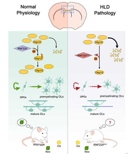 RNF220是毛炳宇研究员团队鉴定的一个泛素连接酶。在过去近几年,该团队联合国内多个研究团队系统地解析了该泛素连接酶在神经系统发育、突触传递及多种相关神经发育障碍性疾病中的重要调控功能与机制(Ma et al, Cell Rep, 2019; Ma& Songet al, Development, 2020a/b;Ma& Liet al, JMol Cell Biol, 2020/2021/2022; Ma et al, SciAdv, 2022; Li et al, Cell Death Dis, 2023)。近期,发表在Brain上的两项人类遗传学的研究表明,携带RNF220基因纯合致病突变位点的病人患有严重的脑白质营养不良、神经纤维髓鞘化水平低下等脑结构性损害,并伴有共济失调、智力障碍等临床表现。但关于RNF220在少突胶质细胞分化发育与神经纤维髓鞘化中的作用和机制,及其突变导致脑白质营养不良等相关疾病的致病机理仍不清楚。