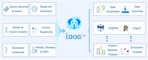 家犬(Canis lupus familiaris)作为最早驯化动物之一,在人类社会中扮演着重要角色。对家犬和犬科动物开展研究对遗传学、医学和生态学多领域发展深有裨益。近日,张亚平学科组联合国家生物信息中心赵文明团队发布新一版犬科动物综合数据库iDog2.0(https://ngdc.cncb.ac.cn/idog/),实现了犬科动物多维组学数据整合,为国内外家犬研究学者提供了有力支撑。