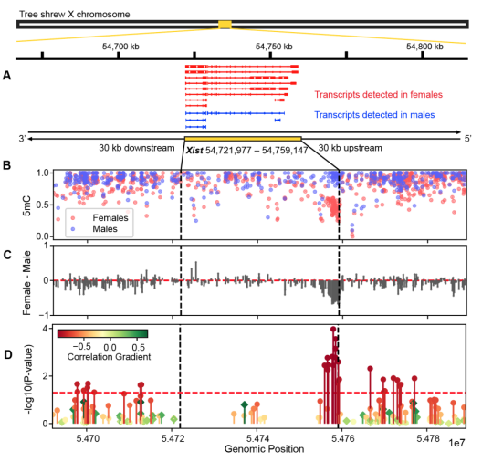 为此,中国科学院昆明动物研究所的石磊课题组和加州大学圣巴巴拉分校的Soojin V. Yi课题组合作,产生了3只雄性和3只雌性树鼩前额叶皮层的全基因组DNA甲基化图谱,并将其与转录组数据进行了共分析,证明了DNA甲基化在全基因组水平对基因表达的影响,同时发现了DNA甲基化在X染色体失活中的调控作用。研究结果表明,雄性和雌性树鼩X染色体之间DNA甲基化水平的整体差异并不驱动树鼩X染色体失活,而是由Xist基因5’端在进化上保守的调控位点介导;此外,通过比较不同物种的DNA甲基化和X染色体调控模式,发现了X染色体DNA甲基化的进化模式与基因组CpG含量密切相关,并确定了Y连锁基因组片段及其低甲基化水平。这些新发现阐明了DNA甲基化和X染色体调控在树鼩大脑进化过程中的保守与全新模式。
