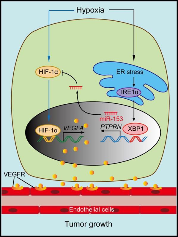 本研究发现miR-153通过靶向作用于HIF1A癌基因mRNA的3’UTR而抑制缺氧对乳腺癌细胞中HIF1α/VEGFA信号通路的激活,从而阻断肿瘤的血管新生,抑制裸鼠移植瘤的生长。该工作还进一步探讨了miR-153的表达调控机制并发现,缺氧可通过触发细胞内的内质网应激(ER stress)反应而激活IRE1α/XBP1信号通路,被激活的转录因子XBP1通过作用于miR-153宿主基因PTPRN的启动子区域而诱导PTPRN和miR-153的共同表达。因此,在缺氧的病理生理条件下,肿瘤细胞一方面快速激活HIF1α/VEGFA通路而促进肿瘤的血管新生,同时也可通过激活内质网应激上调miR-153,从而实现对HIF1α/VEGFA信号通路的负性微调,与其他负性调控因子一起以类似“刹车机制”避免肿瘤细胞内该信号通路的过度激活,维持正常和肿瘤组织的稳态(如图)。在证明了miR-153抑制乳腺癌干细胞的前期基础上,该工作清楚表明miR-153的确是一个强的抑癌基因,可以通过抑制血管新生抑制乳腺癌,miR-153也许将来可以用于乳腺癌的基因治疗。