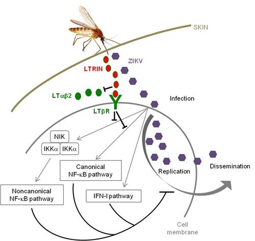 中国科学院昆明动物研究所联合清华大学、中国科学院生物物理研究所、云南省寄生虫病防治所和中国人民解放军军事医学科学院等科研单位,从埃及伊蚊唾液腺中分离纯化得到一分子量为15 kDa的免疫抑制毒素蛋白(命名为LTRIN)并对该蛋白的生物化学特征和生理学活性进行了探索。研究发现,埃及伊蚊在吸血过程中LTRIN的表达显著上调。LTRIN通过抑制淋巴毒素β受体(lymphotoxin-β receptor)信号通路,在宿主吸血部位造成免疫水平低下,从而协助寨卡病毒传播。针对LTRIN的抗体可抑制埃及伊蚊介导的寨卡病毒感染。这项研究:1)探索了埃及伊蚊成功吸血的环境适应机制;2)识别了新型免疫抑制剂候选药物分子;3)研究了虫媒病原传播的机制;4)证明了淋巴毒素受体干预对控制寨卡病毒传播具有重要作用。