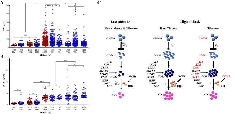 图注:不同海拔藏族和汉族群体的血清NO水平(A)和eNOS(内皮型一氧化氮合酶)水平(B)比较;C,藏族NO钝化调节假说图解。