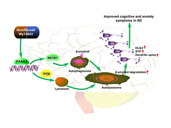 AD的发病机理非常复杂,受多种因素影响,其中血脂异常是AD的重要风险因素之一。研究显示,β-淀粉样蛋白(β-amyloid)的过度产生以及清除不足是诱发AD发病的关键因素。因此,促进大脑中的清除或是预防和治疗AD的重要策略。PPARAPPAR家族的一个成员,可通过靶向目的基因启动子区域的PPAR反应元件从而对参与糖脂代谢以及炎症反应的基因进行调控,从而在细胞分化、发育以及新陈代谢(糖、脂、蛋白质)中起关键性的作用。有研究发现,PPARA基因的遗传变异与AD风险相关。自噬是溶酶体介导的一种普遍存在的机体内细胞降解自身细胞器以及功能异常蛋白的过程。大量研究表明,自噬功能障碍在AD的发病机制中起着重要作用,因此诱导自噬的发生有望成为治疗AD的新视角。