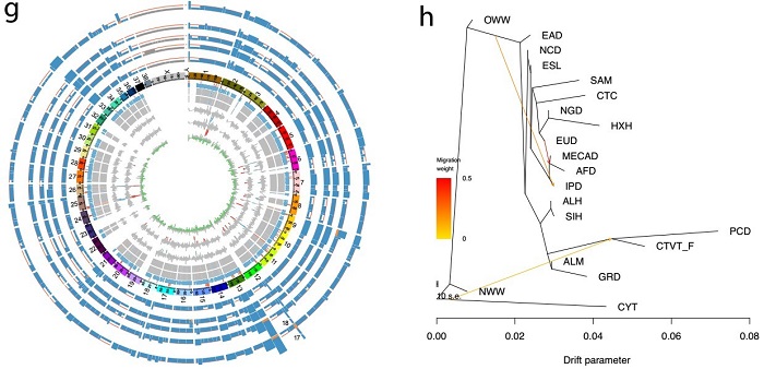 该团队首先开发了首个传染性肿瘤专用的基因型检测工具ttgeno,利用ttgeno获得了每例CTVT全基因组所有位点的基因型信息,通过提取来自4大洲5例CTVT的基因型单态位点,获得了CTVT基因组中包含的最初患瘤个体的基因型和早期体细胞突变信息。通过与包含102个世界各地的现代和古代家犬、灰狼、北美郊狼个体的单核苷酸多态(SNPs)高质量参考数据集进行比较,提出CTVT基因型单态位点与种群参考SNPs数据集的二等位交集,可能属于CTVTfounder的祖先正常多态信息位点。该团队利用突变方向谱方法评估了不同集合的突变特征,证实了这些位点具有典型的家犬突变模式,可以作为CTVTfounder活化石来代表一个古代的群体。进一步,该团队合并参考数据集与CTVTfounder,进行了系统发育关系、群体遗传结构分析,都发现CTVTfounder与北美土著家犬构成单系群,说明了CTVT确实起源于北美土著家犬,且这个单系群与其它世界各地的家犬群体具有一定的遗传距离,与这个单系群最接近的群体是现存的极地雪橇犬。利用几种检验群体间基因流的方法,发现CTVTfounder和北美土著家犬携带一定比例来自北美郊狼和和北美灰狼的基因流,并解析了CTVTfounder这个高覆盖度的活化石基因组中来自野生犬科动物的渐渗区域,得到了确切基因流发生的证据。同时,该团队也肯定了之前北美家犬发生群体替换的结果,现生北美家犬来自欧洲家犬,没有携带任何北美土著家犬的组份。(图1)