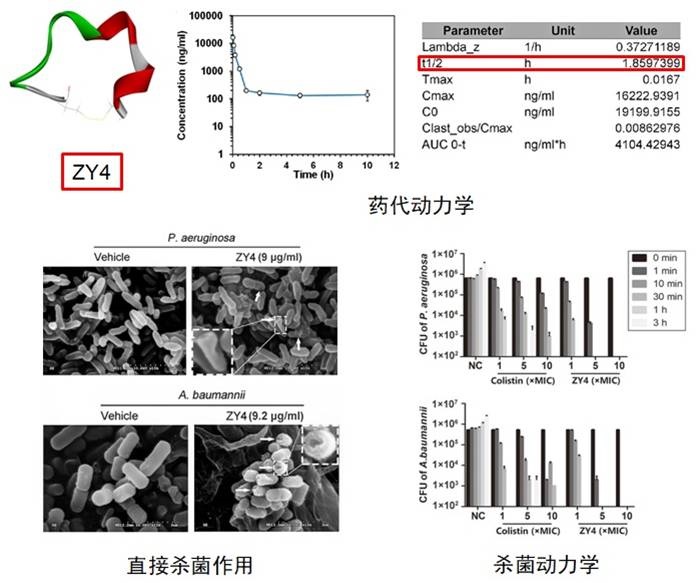 抗菌肽是一类具有抗菌活性的多肽类小分子,因其杀菌快速且很难导致微生物耐药受到全世界的关注,可用于新型抗菌候选药物分子的研发。中国科学院昆明动物研究所赖仞研究员带领的团队识别了超过1000个的抗菌肽,并在此基础上进行抗菌肽的结构功能改造,以提高抗菌活性、降低毒性和成本。ZY4是该团队最近设计改造的抗菌肽,具有强抗菌活性、高稳定性和低毒性。ZY4对耐药鲍曼不动杆菌和绿脓杆菌显示高效快速的杀菌活性,同时ZY4对这两种细菌的生物膜及滞留菌(Persister cells)也有显著的清除作用,其综合抗菌效果明显优于妥布霉素、左氧氟沙星、卡那霉素及头孢替坦等传统抗生素。ZY4长期使用不易产生耐药性,亚抑菌浓度的ZY4与鲍曼不动杆菌和绿脓杆菌持续作用60代后,ZY4对这两类菌的抑菌作用未见明显改变。动物实验表明ZY4可以显著抑制鲍曼不动杆菌和绿脓杆菌在体内的扩散及绿脓杆菌引起的肺部感染和炎症。本研究为应对当前越来越严重的耐药性鲍曼不动杆菌和绿脓杆菌的传播及感染问题提供了良好的候选药物分子,也为设计高效低毒的抗菌肽提供了参考新策略。