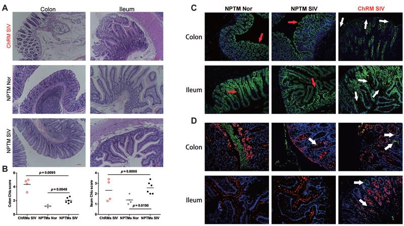 1. SIVmac239感染北平顶猴维持良好的肠道完整性. 正常及SIVmac239感染北平顶猴和中国猕猴结肠/回肠HE染色图(A),Chiu评分(B),紧密连接蛋白claudin-3(绿色,C)及E. coli(绿色,D)免疫荧光染色图。