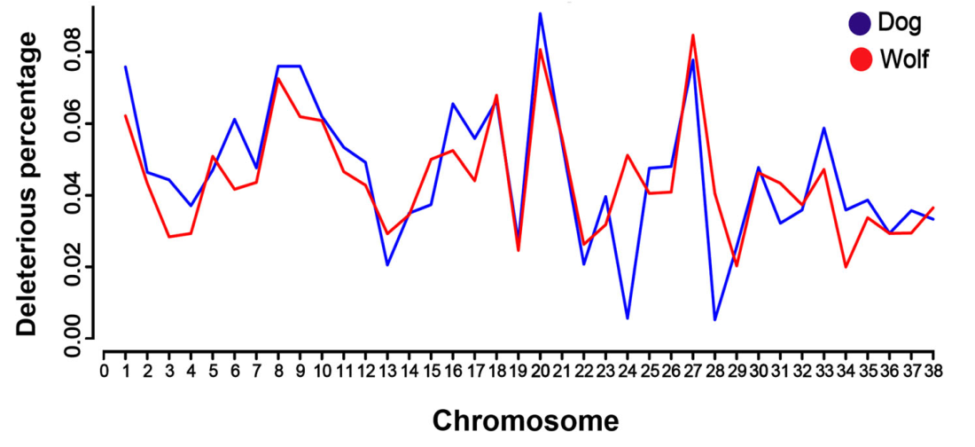 图二:家犬和灰狼各个染色体积累的有害突变比例