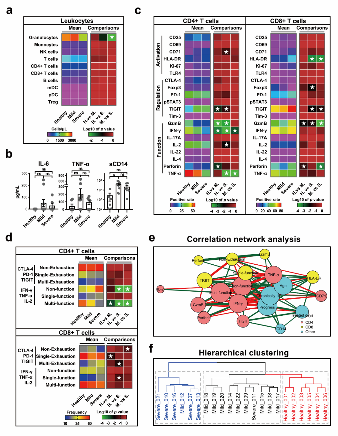 图. 在外周血主要白细胞亚群数量(a)以及炎症介质浓度(b)的水平上,新冠肺炎引起的变化并不明显。但是感染者在T细胞的活化、调控和功能水平上与健康人存在显著差异,并且多种指标与疾病进展相关(c)。聚类分析表明不同的耗竭模式和功能模式是重症进展的主要特征(d)。网络分析表明多功能CD4+T细胞减少和表达多种耗竭分子的CD8+ T细胞增加可能是新冠肺炎进展的重要因素(e)。层级聚类证实这些免疫学风险因素独立于年龄和基础性疾病,能够很好的区分健康人以及轻症和重症患者(f)。
