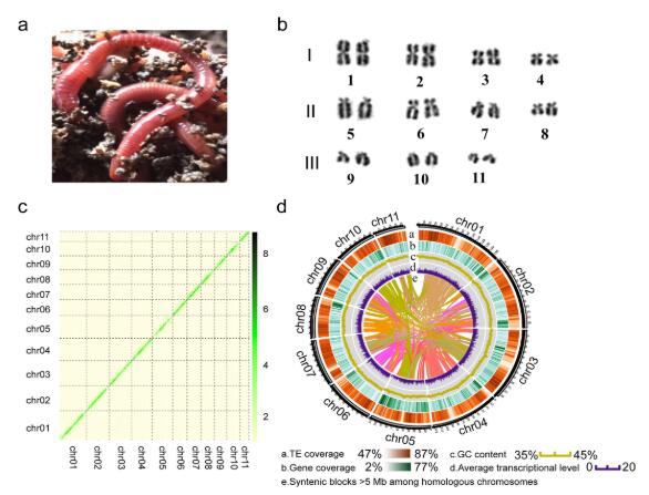 图1:a安德爱胜蚓(用于完成基因组测序物种)。b安德爱胜蚓的核型分析。2n=22,根据染色体形态,初步分成三个亚类。核型分析源于蚯蚓环带的分裂中期细胞,该分析由昆明动物研究所细胞库完成。cHi-C互作图。dcircos展示蚯蚓基因组的特征。