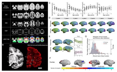 图1:(A)食蟹猴磁共振脑图谱。(B)磁共振脑图谱模板与组织学染色的结果比较。(C)食蟹猴大脑整体脑容量、皮层厚度、以及灰质与白质体积随年龄变化的轨迹。(D)食蟹猴各个脑区的灰质体积和皮层厚度在不同年龄段的变化。(E)皮层厚度和灰质体积同步变化的发育模式。(F)健康食蟹猴群体的大脑结构相对于标准化模型的偏差情况。(G)个体化偏差的极值直方图和极值分布。