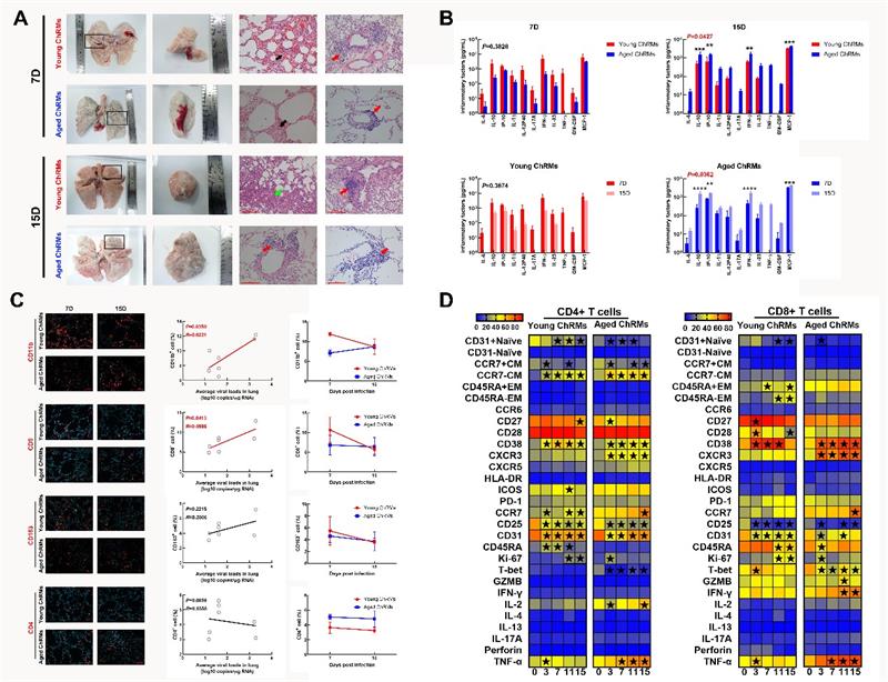 A: 感染后第2周老年猕猴肺部存在持续免疫损伤;B: 感染后第2周老年猕猴出现明显细胞因子风暴;C: 感染后第2周老年猕猴肺部CD11b+细胞及CD8+ T细胞持续浸润; D: 感染后老年猕猴外周血T细胞具有促炎特性。
