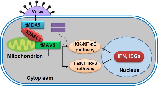 近期,姚永刚课题组集中对树鼩的干扰素刺激基因(interferon stimulated genesISGs),2’5’-寡聚腺苷酸合成酶家族(2’5’-Oligoadenylate synthetaseOAS)进行了研究。该基因家族是干扰素诱导产生的一类具有抗病毒效应的ISGs,作为胞内的模式识别受体(pattern-recognition receptors),和人类疾病密切相关。我们前期发现,树鼩OAS家族基因(tOASs)有4种家族成员(tOAS1tOAS2tOASL1tOASL2),在抗DNA病毒和RNA病毒复制中均呈现出广谱的抗病毒效应,且tOAS1tOAS2的抗病毒效应依赖于经典的OAS/RNase L信号通路Cytokine 2019)。本研究中,我们进一步通过双荧光报告系统筛选发现,tOASL1特异性地正调控RNA病毒诱导的免疫应答反应。过表达tOASL1可以显著促进RNA病毒引起的天然免疫信号通路激活,而敲低或敲除tOASL1则会抑制RNA病毒介导的免疫应答反应。在机制方面,tOASL1与线粒体共定位,可与细胞中免疫因子tMDA5tMAVS相互作用,并担当桥梁的作用,促进tMDA5tMAVS的相互作用,正反馈调节tMDA5-tMAVS介导的干扰素β的产生。在RNA病毒刺激下,与人OASLRIG-I相互作用的方式不同,树鼩中RIG-I缺失,但tOASL1tMDA5tMAVS相互作用,进而实现抗病毒效应的传递,这种调控作用呈现出tOASL1功能的物种特异性。该研究揭示了树鼩干扰素刺激基因OASL1在调节RNA病毒复制中的重要性,拓展了OASL的免疫反应调控功能的认识。该研究结果以TupaiaOASL1 Promotes Cellular Antiviral Immune Responses by Recruiting MDA5 to MAVS为题发表在Journal of Immunology。姚永刚课题组的博士研究生姚玉林是该论文的第一作者,姚永刚研究员为通讯作者。该研究工作得到NSFC-云南联合基金项目、中科院和云南省的资助。
