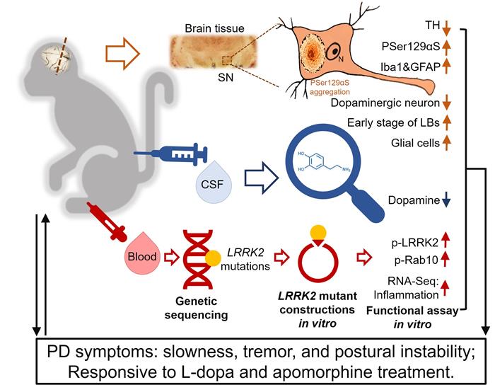 自发罹患帕金森病的食蟹猴具备帕金森病核心表型及其可能的发病机制示意图。