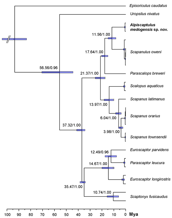 美洲鼹(Scalopini)族隶属于哺乳纲鼹科,该类群的宏进化异常复杂。现生美洲鼹族共4属6种,除甘肃鼹(Scapanulus oweni)零星分布在我国中部甘肃、陕西等地外,其余物种全部分布于北美。但化石记录显示,美洲鼹族曾广布北美和欧亚大陆,包含至少14个属。目前美洲鼹的起源地尚未确定,但中新世该类群至少发生过三次“迁出北美”事件,其中至少两次通过“白令海峡”来到东亚,进入我国。该类群第一次迁入我国后保留了甘肃鼹这一孑遗种,而第二次迁入所形成的Yanshuella primaeva+ Yunoscaptor scalprum都已灭绝。