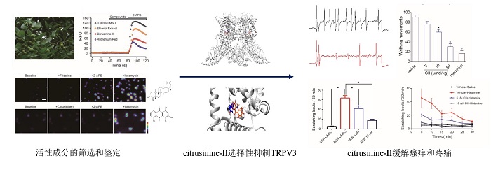 TRPV3通道是钙离子通透的非选择性阳离子通道,主要分布于皮肤角质化细胞。遗传学和药理学研究表明TRPV3通道与皮肤的多种生理和病理功能密切相关,是介导瘙痒的重要靶点。我们采用Flexstation和钙荧光成像技术对功能化合物进行活性跟踪,全细胞膜片钳对瘙痒相关靶点进行功能筛选,以及小鼠瘙痒和镇痛模型进行止痒镇痛活性评价,发现了具有高选择性和高活性的TRPV3通道抑制剂citrusinine-II。该化合物通过与TRPV3通道跨膜螺旋上的Y564形成π-π键,抑制TRPV3通道的激活。动物实验发现citrusinine-II能够有效地缓解AEW诱导的小鼠慢性瘙痒和组胺诱导的小鼠急性瘙痒,同时citrusinine-II对于多种小鼠疼痛模型具有显著的镇痛活性。该研究发现了化学结构和止痒镇痛机理明确、安全性高的先导分子,为奥姆斯特德综合征和遗传性掌跖角皮病等顽固性瘙痒和疼痛疾病的治疗提供了新思路。