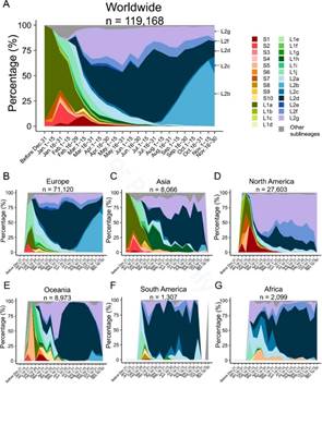 为阐明不同亚谱系的病毒的流行程度是否有所不同,作者依据上述谱系划分系统对有具体采样时间信息的119,168个高质量病毒基因组进行划分,并挖掘了这些谱系的时空分布演变规律。研究发现,各个谱系在不同地域上的传播表现十分不同。例如,在欧洲(n=71,120),大多数病毒属于L谱系(70,434,99.0%),其中L2d(26,206,36.8%)和L2b(19,416,27.3%)是两个最大的亚谱系,而在亚洲(n=8066),S谱系占到了7.1%(576),L谱系最初以L2d(2381,29.5%)为主,但随后L2g的频率显著增加。其余大洲各个谱系出现的频率也不尽相同。图2结果显示在地理条件、交通运输、文化风俗、防疫政策、超级传播者等各种因素共同作用下,病毒谱系在不同地域之间有各自独特的分布模式,这为病例的分子溯源提供了理论依据。