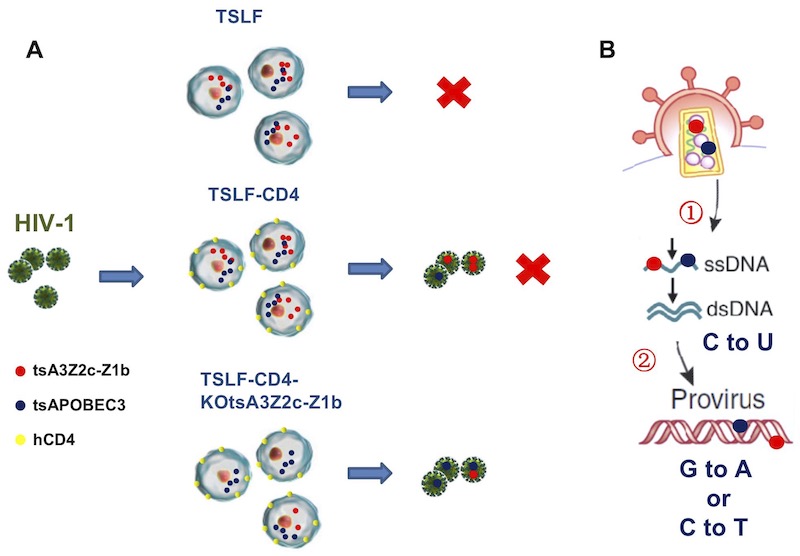 图.树鼩细胞支持HIV-1复制但不能自然感染的分子机制。 A. HIV-1不能自然感染树鼩肺成纤维细胞 (TSLF);HIV-1能够自然感染稳转人CD4的树鼩肺成纤维细胞 (TSLF-CD4),但子代病毒失去感染活性;敲除内源性A3Z2c-Z1b后 (TSLF-CD4-KOtsA3Z2c-Z1b),一定程度恢复子代病毒感染活性。 B. 树鼩APOBEC3限制因子能够有效包裹到HIV-1子代病毒颗粒中,在二轮感染中①抑制病毒逆转录过程,②在病毒基因组上参入G-A的突变。