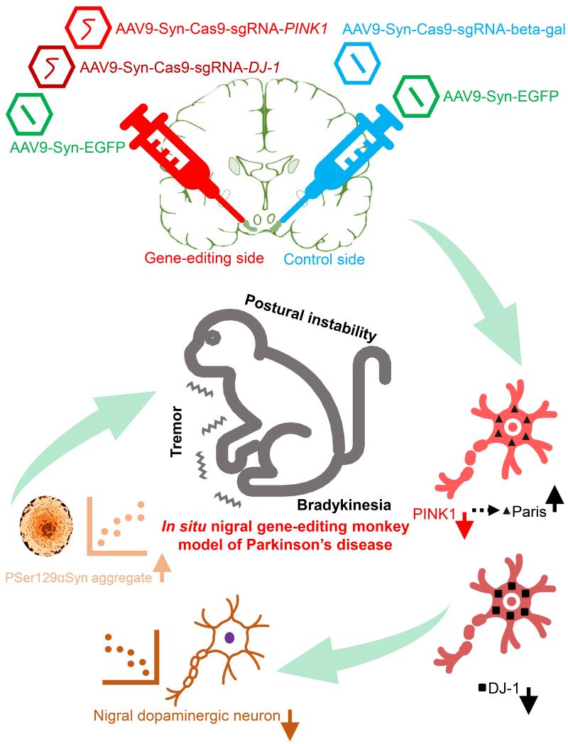 图1. AAV9介导的CRISPR/Cas9基因编辑导致成年猕猴出现帕金森病核心表型。