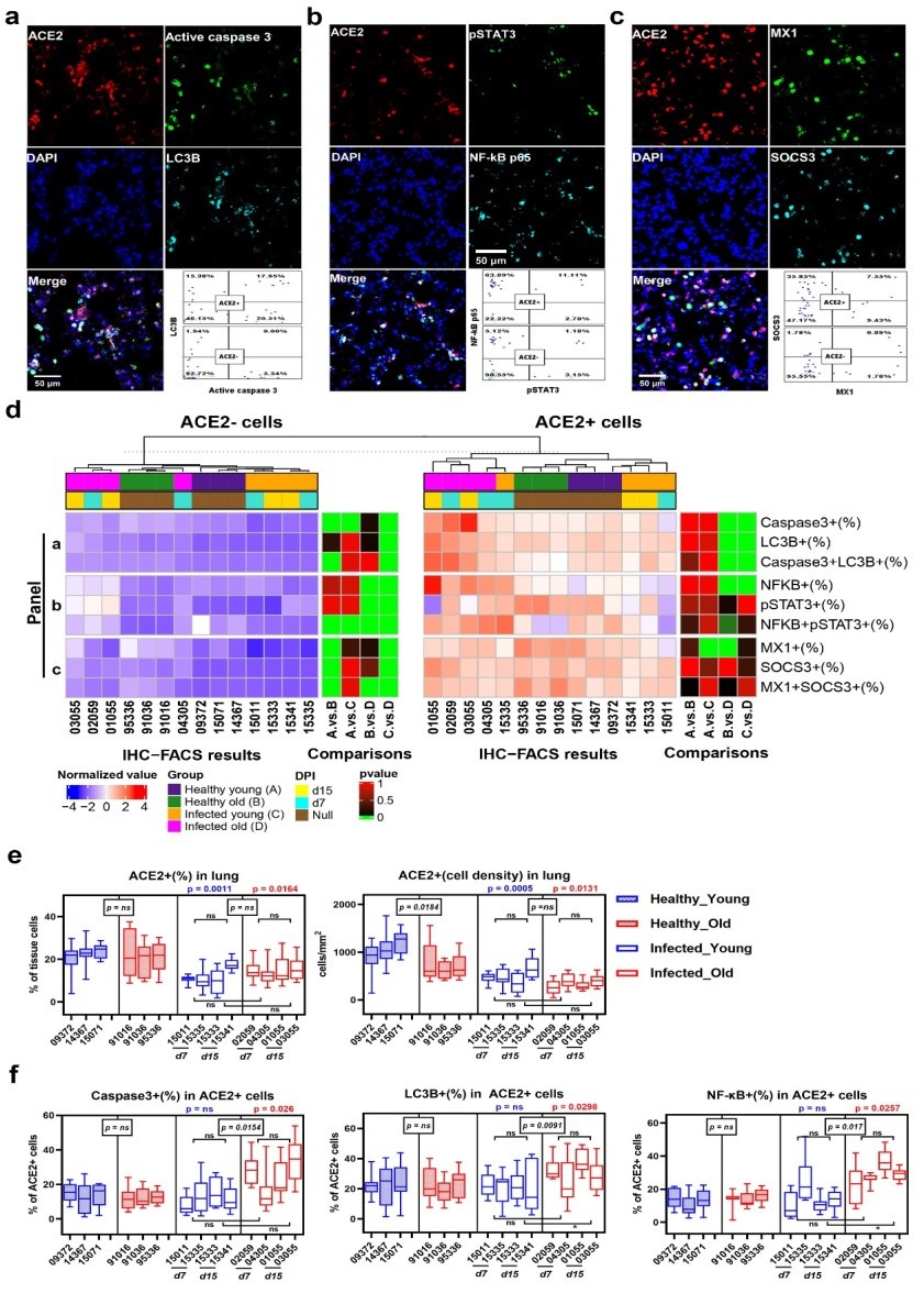 图:老年猕猴感染SARS-CoV-2后肺组织中ACE2+细胞的病理变化加重。(a-c) 免疫荧光图像展示肺组织ACE2与其它蛋白的共染色结果,包括细胞凋亡、自噬、炎性信号激活和I型干扰素信号激活。(d) 热图展示健康年轻、健康老年、感染年轻和感染老年组的ACE2+和ACE2-肺细胞的表达差异。(e) ACE2+肺细胞的比例和密度在四组间的差异。(f) ACE2 +细胞中caspase3、LC3B和NF-κB表达细胞在四组间的差异。