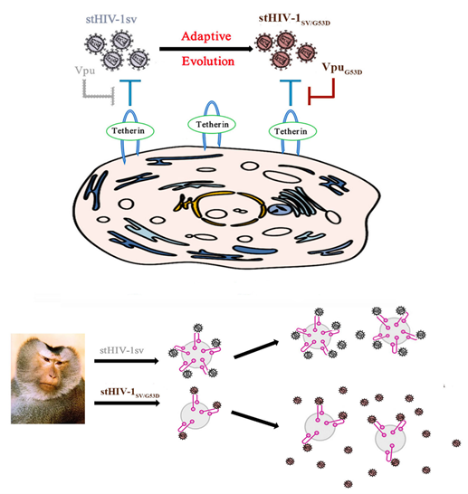 在本研究中,中国科学院昆明动物研究所郑永唐研究员学科组博士研究生路莹基于前期构建的stHIV-1sv感染的北平顶猴动物模型,从感染不同时间点的外周血细胞中分离病毒,拟分离感染性更强的北平顶猴适应性毒株。研究结果显示,感染后137周分离的病毒体外感染性远远强于原始株和其它时间点分离的病毒。病毒全长测序发现,Vpu蛋白保守位点发生了VpuG53D突变。