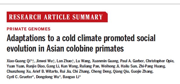 以上研究以Adaptations to a cold climate promoted social evolution in Asian colobine primates为题,在线发表于《科学》。西北大学齐晓光、李保国,昆明动物所吴东东和澳大利亚西澳大学Cyril C. Grueter为该文章的共同通讯作者。