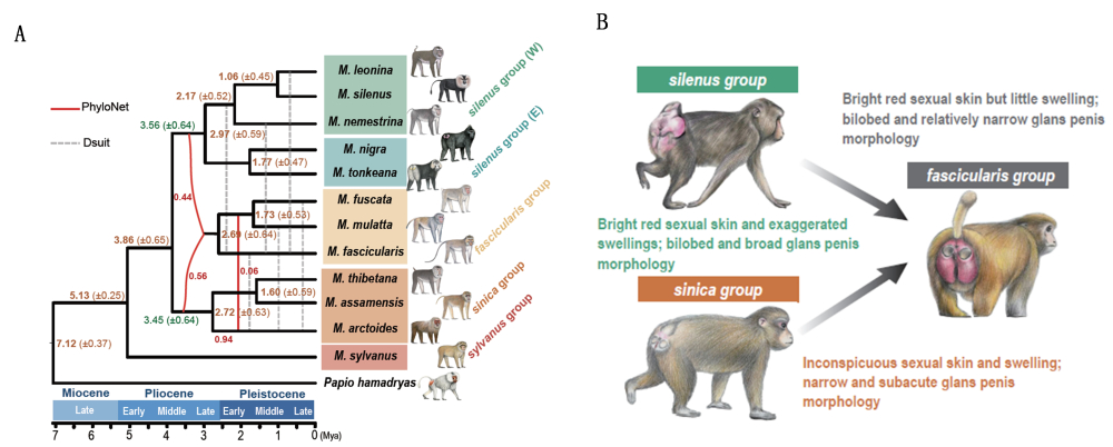 猕猴属(Macaca)是旧大陆猴中分布范围最广、物种多样性最为丰富的非人灵长类之一,其中一些物种如恒河猴、食蟹猴也是最常用的实验动物。新冠疫情暴发以来,猕猴在新冠肺炎疫苗研制和评价方面发挥了不可替代的作用。尽管猕猴的重要性不言而喻,但到目前为止,人们对猕猴遗传资源的开发利用以及猕猴物种间的演化认识还比较局限。本研究利用先进的基因组测序技术组装了10个新的、高质量猕猴参考基因组,这些基因组涵盖了猕猴属各主要演化支系。通过系统基因组学分析发现猕猴属的食蟹猴种组(M.fascicularis group)是由狮尾猴种组(M.silenus group)和斯里兰卡种组(M.sinica group)杂交形成,根据时间估算,杂交成种事件大约发生在3.45-3.56百万年(图A),可能与上新世中早期马来半岛与大陆连接的路桥(如克拉地峡)被海平面反复浸没有关。有趣的是,杂交成种使得食蟹猴种组(恒河猴、食蟹猴、台湾猕猴和日本猕猴)产生了新的生殖性状,如生殖器形态、性皮特征等刚好介于两个亲本之间(图B),并且在遗传上,生殖相关的基因有明显的重组痕迹且受到达尔文正选择作用。同时,该研究还发现X染色体和基因组低重组区在抵抗与亲本的基因交流方面发挥了重要功能,有利于维持杂交后代物种的完整性。