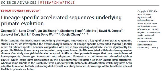 以上研究以Lineage-specific accelerated sequences underlying primate evolution为题,发表于《Science Advances》。吴东东和张国捷为文章的共同通讯作者。