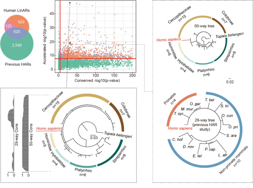 该研究通过大规模灵长类比较基因组学解析,鉴定了灵长类关键演化节中快速演化的基因组保守元件,解析了这些快速演化的DNA保守序列对灵长类动物表型多样性演化造成的功能影响。该研究为深入了解灵长类动物演化、尤其为人类大脑独特演化发育模式研究提供了新见解。