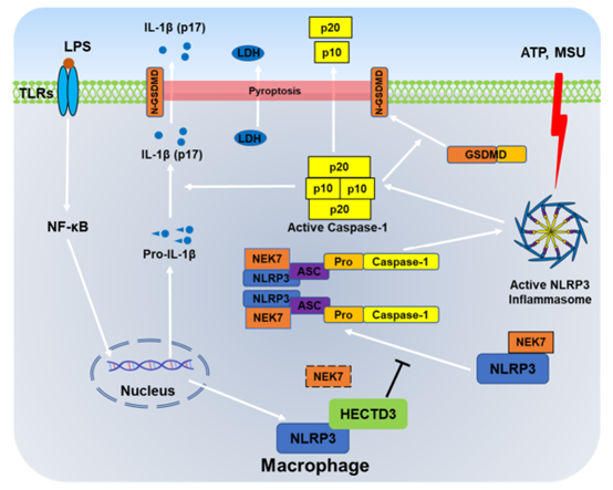 NLRP3是一种细胞内模式识别受体。NLRP3在感知内源和外源性的各种刺激后,其能够通过招募NEK7、ASC及pro-Caspase-1等蛋白从而组装成能够介导pro-Caspase-1酶原激活的复合物,该复合物即被称之为NLRP3炎症小体。炎症小体组装能够促进Caspase-1的切割与活化,活化后的Caspase-1一方面能够介导促炎细胞因子IL-1β和IL-18的切割与成熟,另一方面还能够促进GSDMD切割以促进细胞焦亡,这两个过程共同导致炎症反应的发生。NLRP3炎症小体的激活需要预激活信号与激活信号两个信号步骤。预激活是由TLRs、 NOD2和TNFR1/2等受体介导的NF-κB信号通路活化从而上调NLRP3和pro-IL-1β的转录及表达的过程;激活是由ATP、尿酸钠晶体、尼日利亚菌素等多种类型的内源或外源性物质介导NLRP3的构像改变从而促进NLRP3炎症小体的组装过程。由于NLRP3炎症小体的激活因子最为广泛,相关疾病类型众多,因此成为目前免疫学研究领域最为热门的靶点之一。