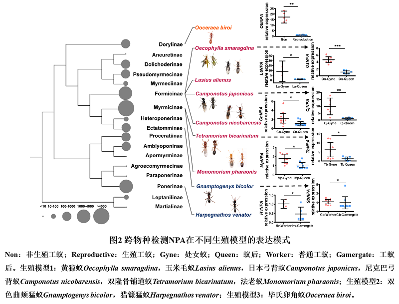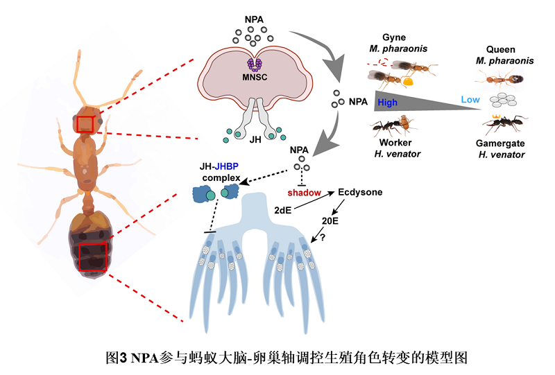 中国科学院昆明动物研究所生物多样性基因组学研究团队长期致力于对社会性昆虫大脑的研究,此前在比较了不同生殖方式蚂蚁的大脑转录组数据后发现Neuroparsin-ANPA)是最早响应生殖转变的差异表达基因,并且这一基因在非生殖状态的个体中保持着更高的表达状态,猜测NPA处于调控蚂蚁生殖可塑性的重要位置。研究团队以此为基础,检测了NPA在上述几种不同生殖模式的表达差异和在大脑中的表达位置后,发现NPA保守性地表达在蚂蚁大脑的中央神经分泌细胞中,并且表达模式均为非生殖个体高表达。在以法老小家蚁(Monomorium pharaonis)为代表的处女蚁/蚁后的生殖模式中,利用RNA干扰和过表达技术,发现NPA对卵巢中卵子发育的抑制性作用;长期实验显示NPA影响了个体的活动力和觅食行为,推测NPA是维持非生殖行为的重要因子。此外,利用猎镰猛蚁(Harpegnathos venator)探究普通工蚁/工蚁后生殖模式的实验中也证明了NPA对工蚁卵子发育的抑制作用,以及对捕食行为的影响。