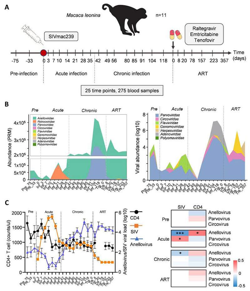 . SIV感染过程中北平顶猴血液病毒组的演化及作用. (A). SIV感染北平顶猴模型构建;(B). SIV感染过程中血液病毒组的演化;(C). SIV感染过程中,血液指环病毒与SIV和免疫系统的动态关系。