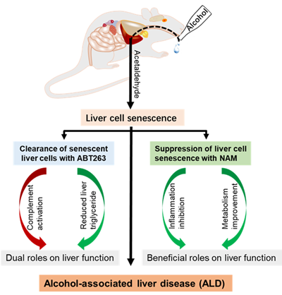 图1. 清除衰老细胞或抑制细胞衰老对酒精性肝病(ALD)的作用。